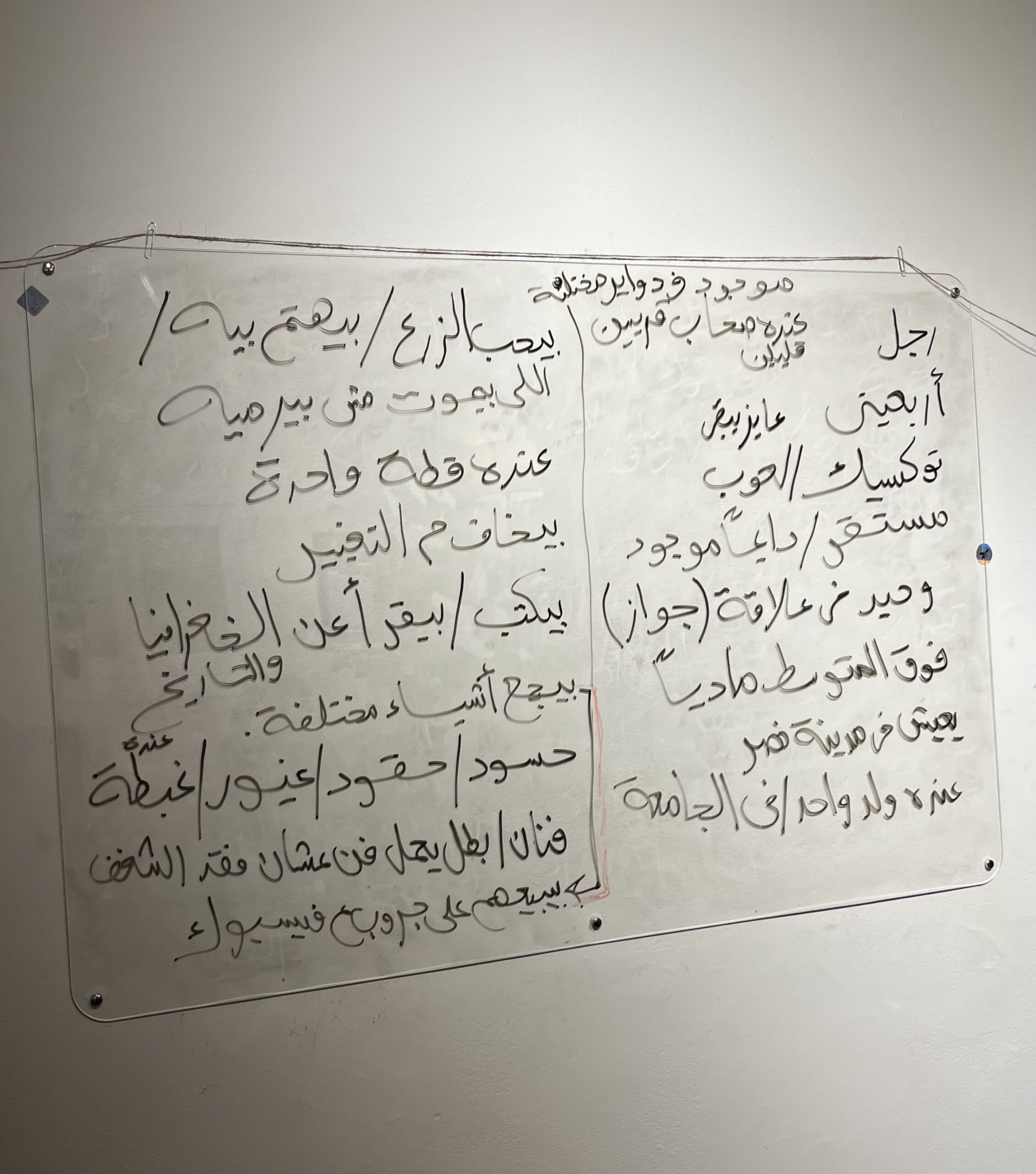 في التمرين دا، المشاركين والمشاركات بيتخلوا موضوع المورشة شخص وبنبدأ سوا نرسم شخصيته، والتمرين اللي بعده بيكون إن كل مشارك بيتخيل نفسه على علاقة ما بالشخص دا وبيكتب له جواب من موقع علاقته بيه.